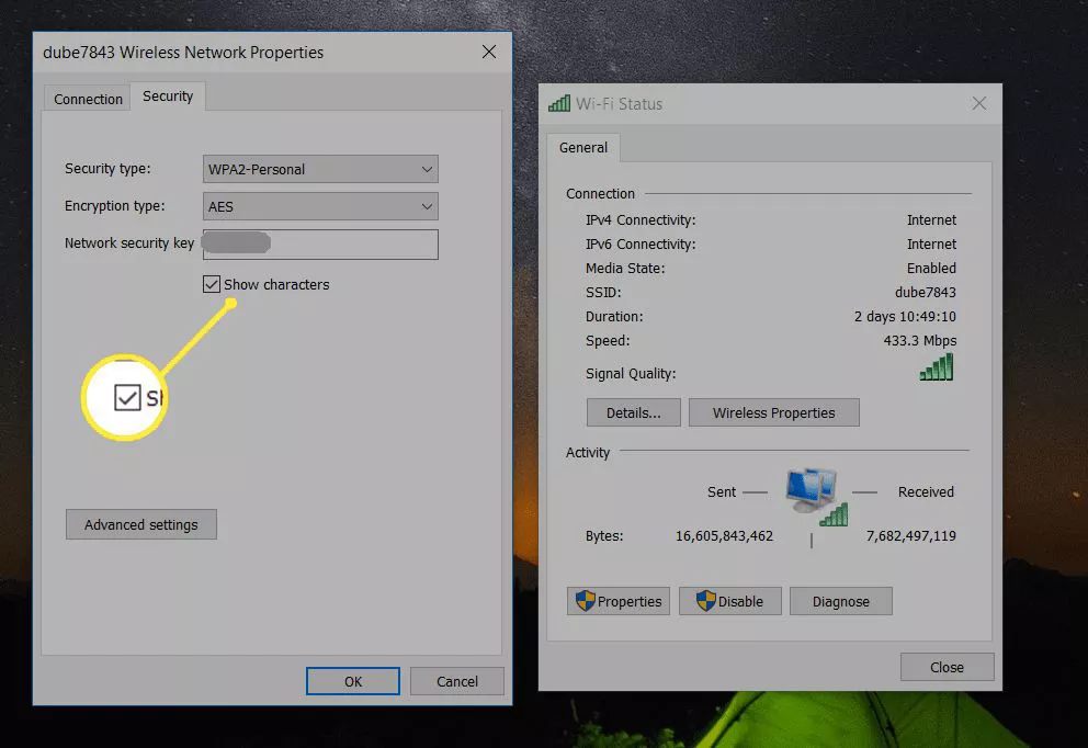 5. گزینه Security را انتخاب کنید. سپس در قسمت Network Security Key ، گزینه Show Characters را انتخاب کنید تا رمز عبور شبکه قابل مشاهده شود.