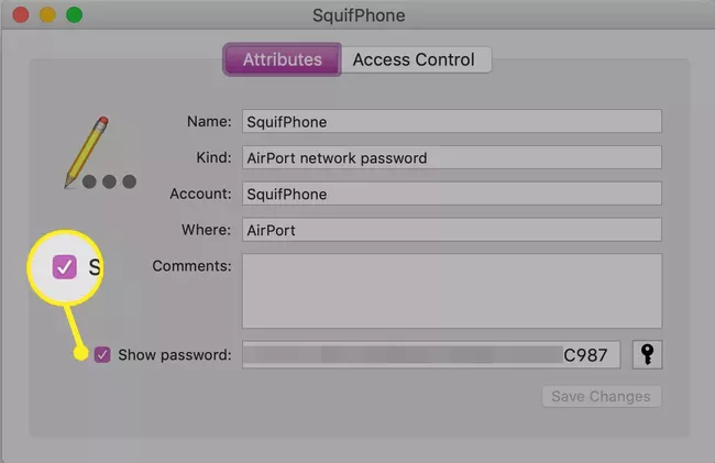 6. گزینهٔ Show Password (نمایش رمز عبور) را انتخاب کنید. ممکن است برای نمایش رمز، لازم باشد رمز مدیر مک (Mac admin password) را وارد کنید.